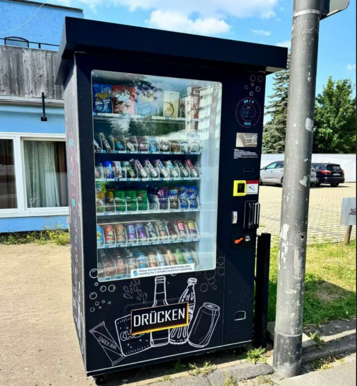 Outdoor-tauglicher Snack- und Getränkeautomat mit Altersverifikation, ausgestattet mit Kühl- und Heizfunktion, wasserdicht und diebstahlsicher